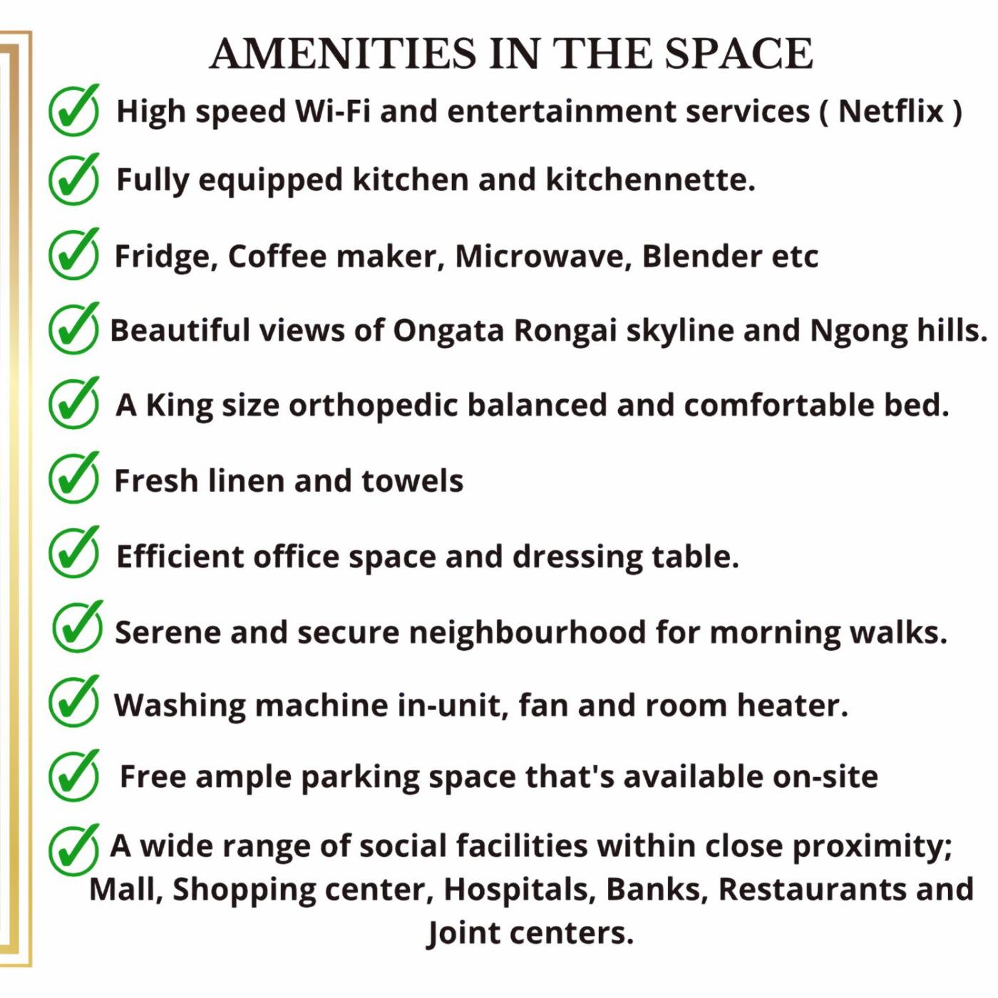 Shifteye Gallery is 700 metres from the accommodation, while Royal Nairobi Golf Club is 1.3 km away. Wilson Airport is 5 km from the property, and the property offers a paid airport shuttle service.